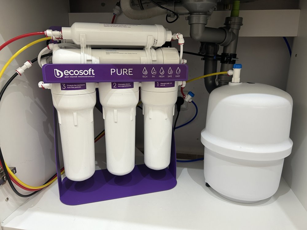 Požiadavkou zákazníka bola tiež úprava pitnej vody v kuchyni takým spôsobom, aby mala lepšiu chuť a vôňu a predovšetkým, aby neobsahovala kontaminanty akými sú mikroplasty, nečistoty, ťažké kovy a prebytočný chlór. S ohľadom na nižší tlak vody u zákazníka sme navrhli reverznú osmózu Ecosoft P'URE Alkafuse s čerpadlom, ktorá tento problém účinne vyriešila.