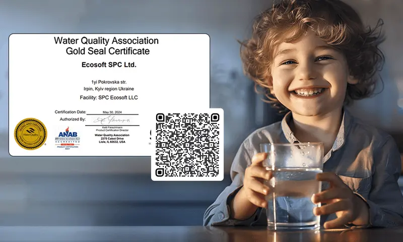 Certifikát asociácie WQA (Water Quality Association), ktorý spĺňa normy NSF/ANSI 58:2022, NSF/ANSI/CAN 372:2020 a CSA B483.1:2017, a certifikát CE pre elektrické zariadenia, ktorý zaručuje najvyššiu kvalitu a bezpečnosť.